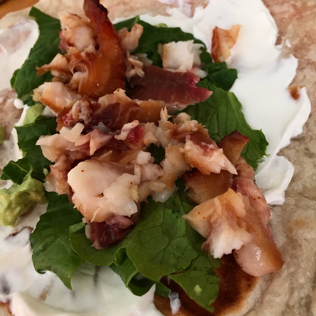 Fish tacos: tilapia soaked in soy sauce base with taco seasoning and onion powder, homemade guacamole and Romane lettuce from our garden.