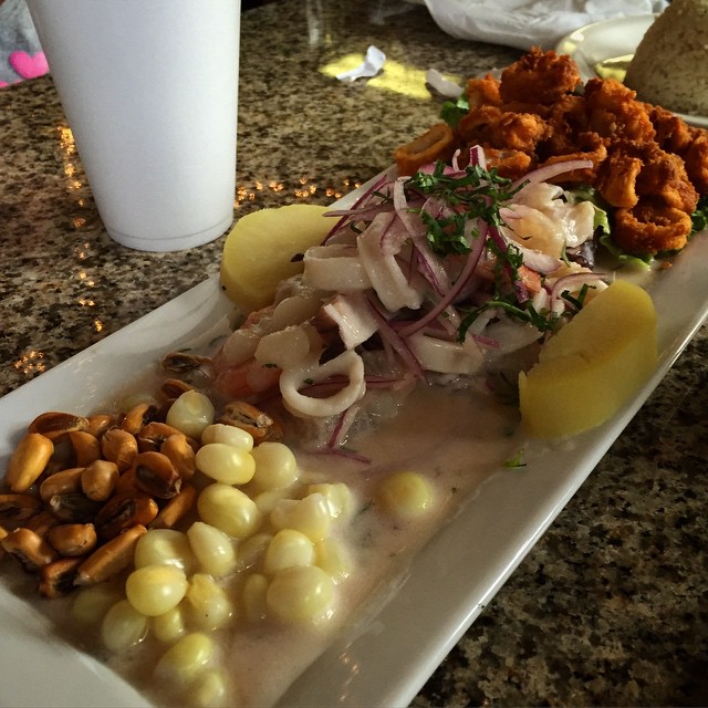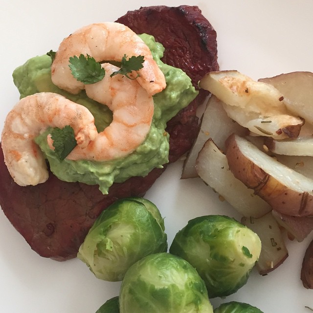 For the wifey: Brined applewood-smoked steak with homemade guacamole topped with shrimp in a honey-lime and cilantro glaze made from scratch, served with rosemary-garlic potato cuts and steamed brusselsprouts.