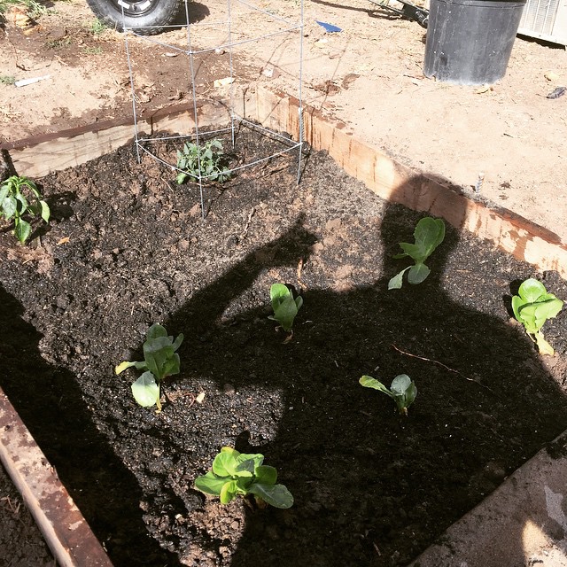 Romane lettuce, roma tomatoes and red bell peppers in the ground: start the clock.